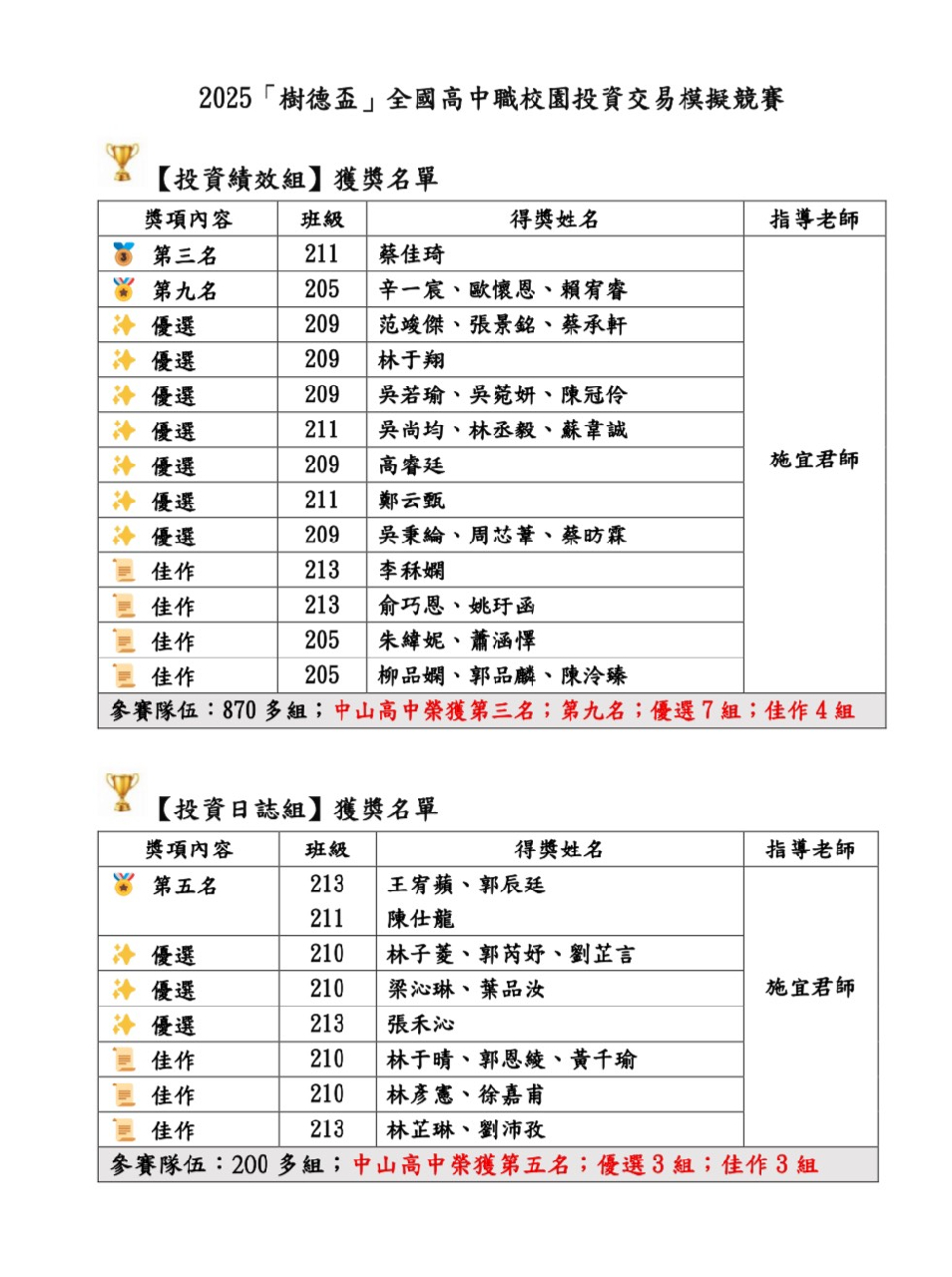 【投資日誌組】參賽隊伍:200多組;中山高中榮獲第五名;優選3組;佳作3組
